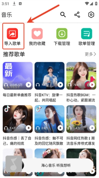 3. 能够发现,第三方歌单已顺利导入海心音乐app。你既可以点击“全部播放”在线畅快聆听,也可以点击右上方的功能栏。