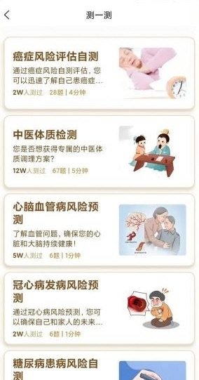 同时,还设有众多在线健康自测项目,借助软件的引导能迅速开展测试,助力你快速筛查健康风险。