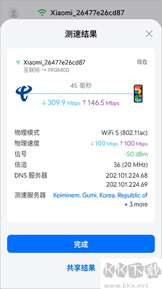 2. 测速结果呈现多项信息,诸如速率、信号强度、信道以及DNS服务器等,助力分析网络状态。