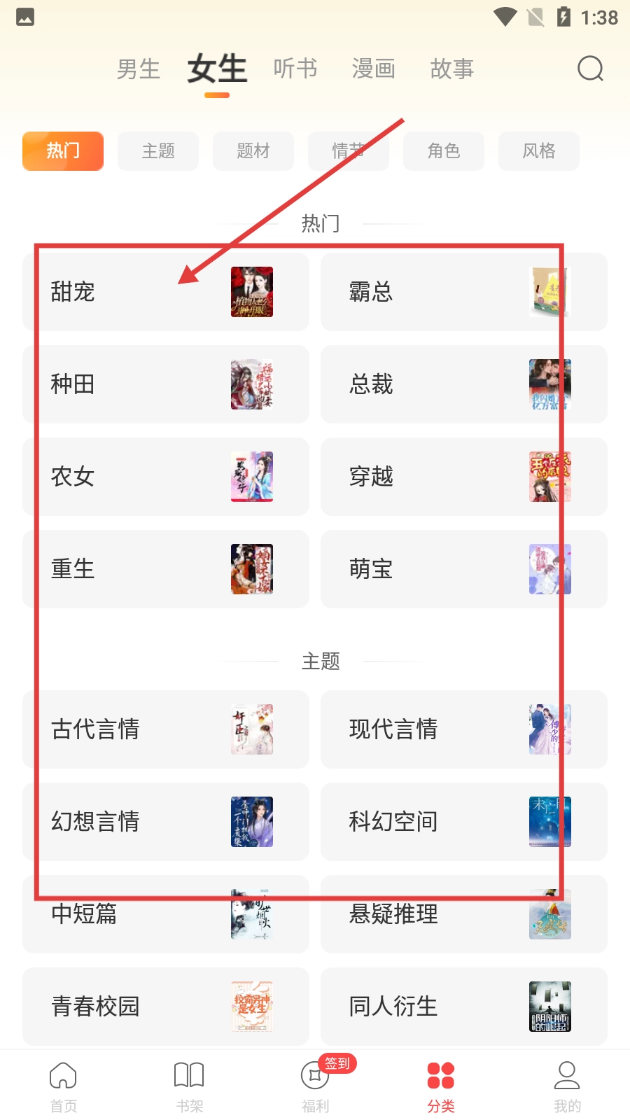 1、在首页底部点击【分类】按钮,进入女生小说分类页面后,就能看到【甜宠】【霸总】等不同类型的小说类别。