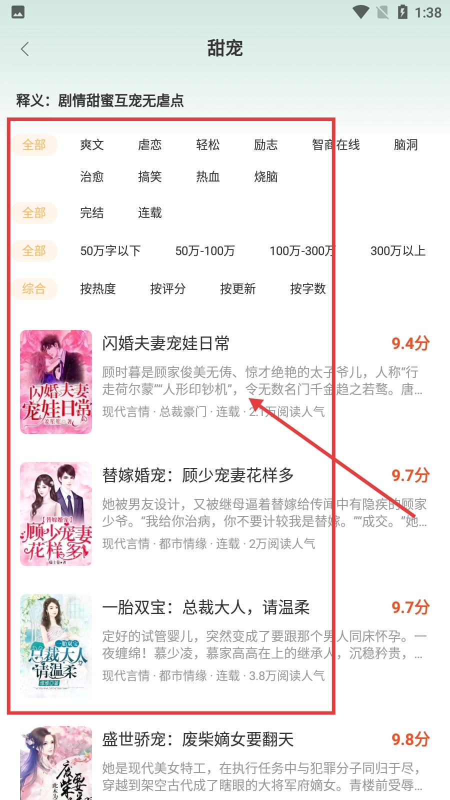 2、在女生分类页面,例如点击【甜宠】类别进入甜宠小说列表页后,能够筛选出不同类型的甜宠小说。
