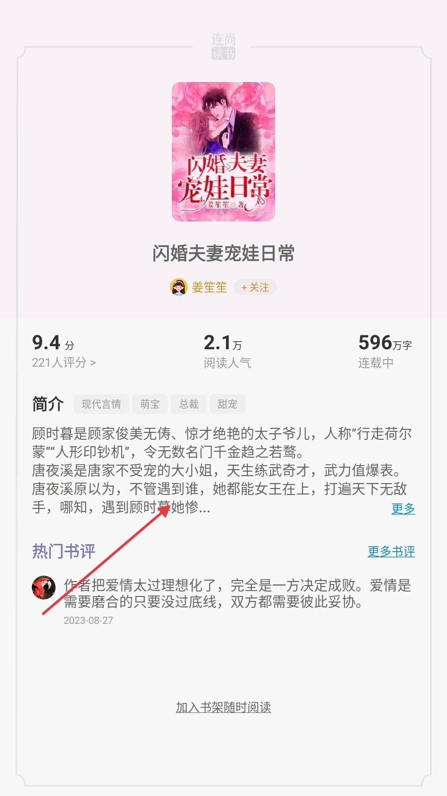 4、进入《闪婚夫妻宠娃日常》的详情页面,你可以了解这部小说的具体剧情,浏览热门的读者评论,并且能够点击【加入书架】按钮,以便随时进行阅读。