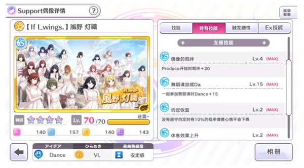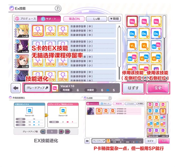 5、所有偶像都能获取大量EX技能,这些技能可通用在她持有的所有S卡上,但要注意单个技能仅能用于一张卡,组合搭配时需留意这一点;此外EX技能支持进化,当凑齐十个同一稀有度的技能后,就能将其进化为下一稀有度。