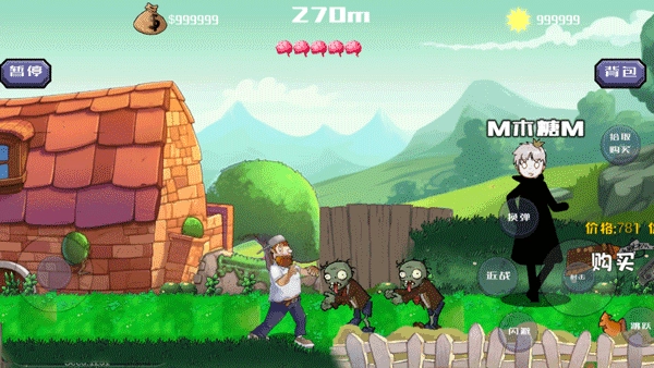 当僵尸逼近戴夫时,戴夫就会被啃食脑子,从图里能看到戴夫目前的生命值是4个脑子,每遭受一次攻击就会消耗一个脑子。游戏前期的僵尸实力相对较弱,如果没有足够的太阳和金币去购买装备,那就拼命点击“近战”按钮来抵御;到了后期有了资源,记得优先购买装备提升战力!