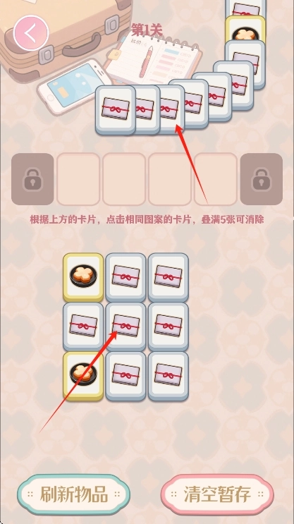 在新手关卡里,你需要学习把下方的卡片和上方刷新出来的相同图案叠在一起,完成第一次五张卡片的消除任务。