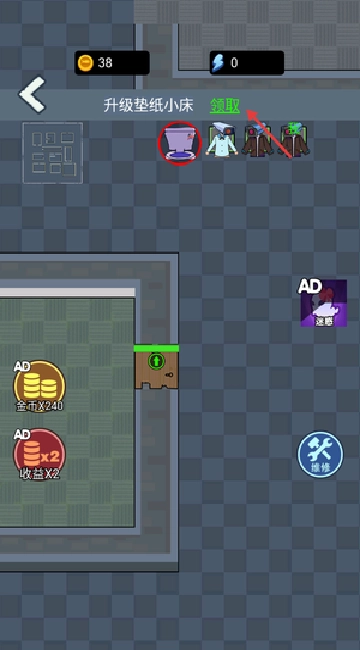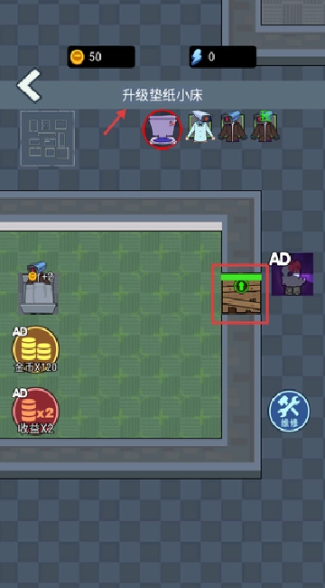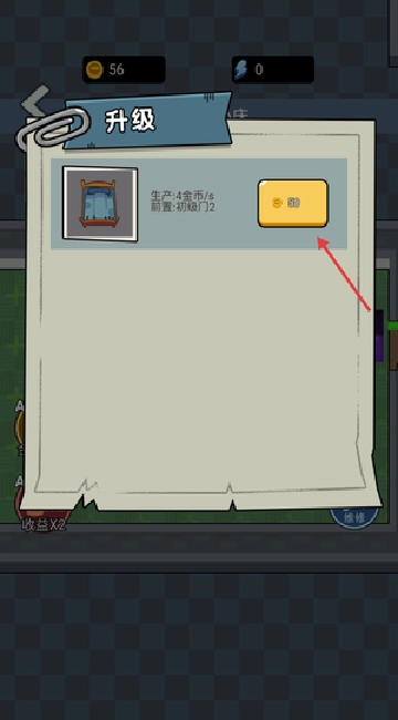 进入房间后,先点击右侧的木门进行升级,以此加固入口的防线,另外还要准备好金币,为之后升级小床做准备。
