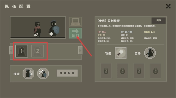 在【队伍配置】界面中,把【士兵-贝利欧斯】调配到1/2号位,核实其【HP-106】等各项属性无误后,点击【GO】按钮即可完成队伍的部署操作。