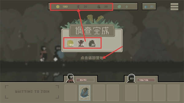 完成探索后触发【调查完成】状态,即可获得【180金】等奖励,之后点击【返回营地】按钮回到初始区域,为后续行动做准备。