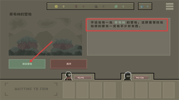 发现【哥布林的营地】,界面提示该营地存有哥布林的物资,点击【接近营地】按钮即可对该区域展开进一步探索。