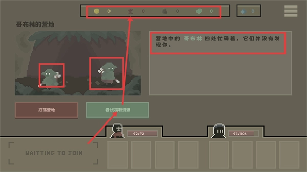 进入【哥布林的营地】后,哥布林没察觉到我方的存在,选择【尝试窃取资源】这一选项就能获得物资,这个时候要留意维持队伍的状态。