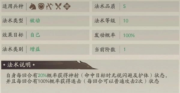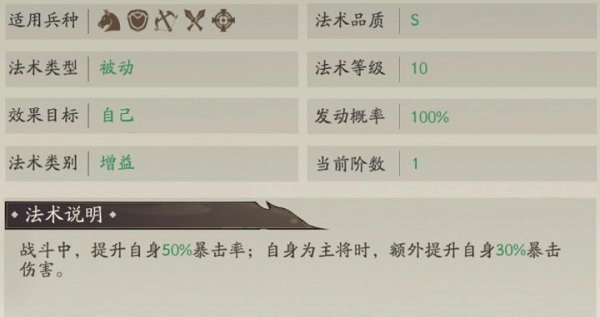 固有被动法术“南天冰魄”能为自身带来可观的暴击率与暴击伤害加成。兵符进阶后的质子旅,可在战斗前三回合提升全军暴击率,使暴击触发更为稳定。剩余两个法术可选择“劈波斩浪”与“电闪雷鸣”,这两个高额物理伤害的法术能够瞬间造成大量伤害。