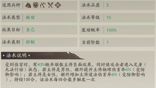 作为队伍里的全能辅助,其固有被动法术“九曲葬花”既能增强主将的物理伤害,又能确保主将免受负面效果影响,还能对敌方施加控制,以此保障队伍稳定的输出能力。搭配法术“纵横捭阖”,在提升自身防御的同时代替友军承受攻击,既能维护双C的良好状态,又能稳定触发固有法术。剩余的法术建议选用“岿然不动”,它可在战斗前2回合给敌军群体附加畏怯(无法普通攻击)状态,第3回合则为兵力最低的单体恢复血量,进一步优化输出环境。