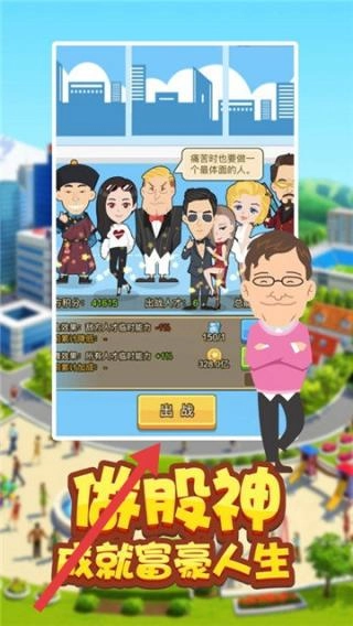 在“做股神”玩法里,点击红箭头所指的【出战】按钮,完成角色搭配后参与股神挑战,以此积累财富。