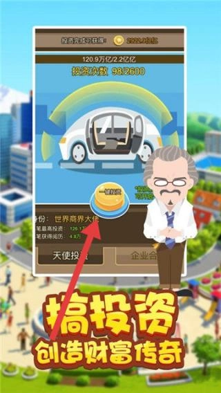 进入“搞投资”板块,点击红箭头所指的投资按钮,挑选项目,开启财富传奇之旅,提高收益水平。