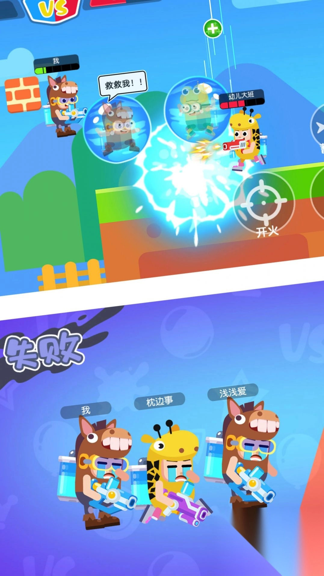 水上乐园、沙滩派对、校园操场等鲜明的对战场景中,均设有可击落的玩具、能改变地形的喷水装置等特殊互动元素。