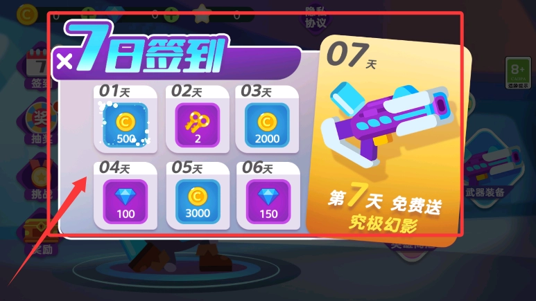 登录后可以进行签到领取每日奖励,积攒的金币能够用来购买特色水枪装备和道具。