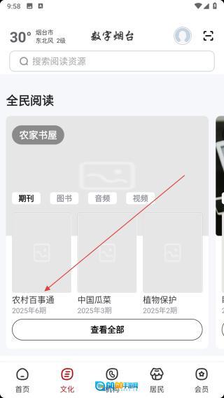 2、进入文化页,在“农家书屋”栏点【农村百事通】。