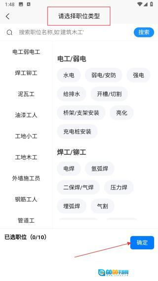 2、在【请选择职位类型】页,选对应类型后点【确定】进入职位列表。
