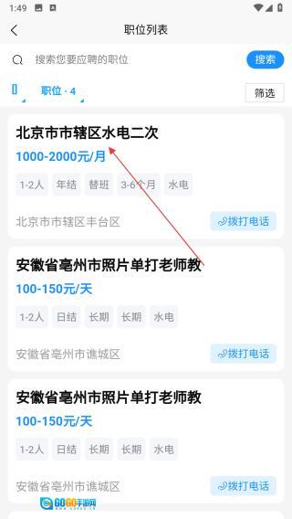 3、在职位列表页,点击感兴趣职位如【北京市市辖区水电二次】进入详情。