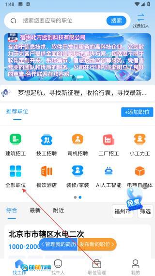 1、打开软件,在首页点击【全部职位】进入职位类型选择页。