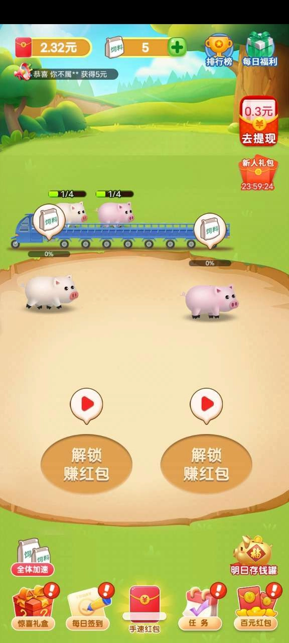 天天养金猪红包版是一款十分有趣的模拟养猪游戏,玩法轻松简单,还能在游戏中领取丰厚的红包奖励!随着猪的等级提升,收益也会不断增加,喜欢这类游戏的朋友可别错过,快来试试吧!