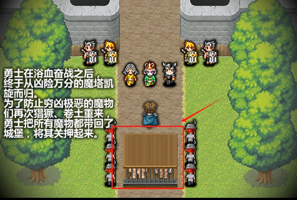 2、土路上有手持武器的村民与士兵。位于中间的蓝色衣服角色是主角,下方木栅栏里关着魔物,要注意别被士兵发现。