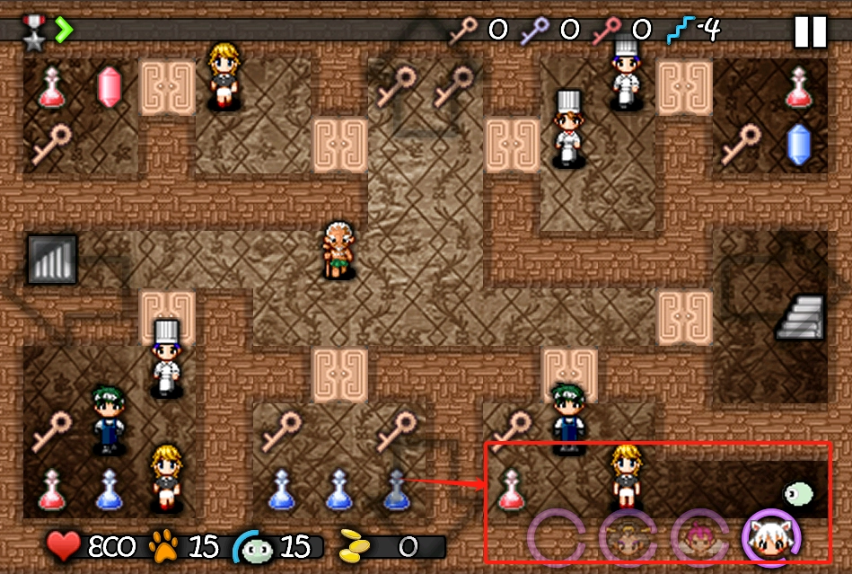 3、左上角显示药水的补充状态,上方已获取的钥匙数量显示为0。中间位置显示生命值800和步数15,右下角的四个圆圈是技能图标,可根据需要点击使用。