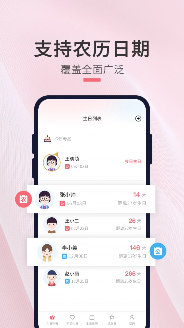 2、【自由添加】用户可以自由添加重要日期,本产品还支持设置农历日期,让每一个重要的生日与纪念日都尽在掌握。