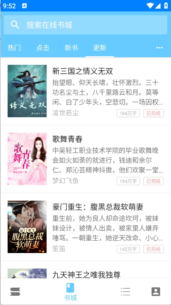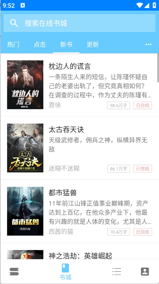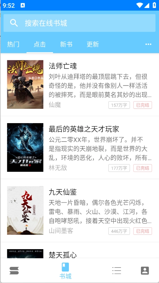 “书城”页面汇聚了海量小说资源,涵盖玄幻、武侠、都市等多种类型。