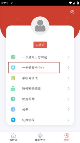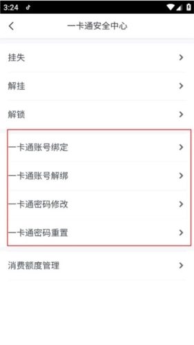在我的界面找到一卡通安全中心入口,进入后根据自身实际情况,可进行挂失、解绑(比如更换手机号)、修改密码等操作。