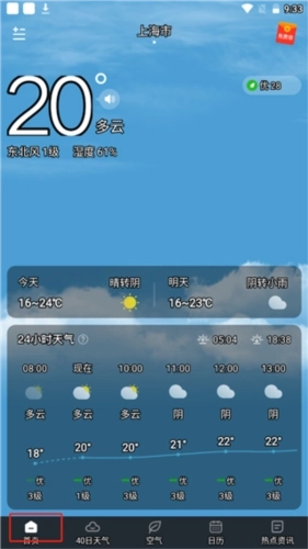 1、打开在本站下载的软件并进入,在首页界面,用户能够查看当前逐时的天气状况。
