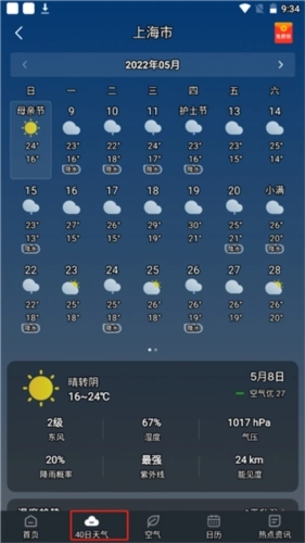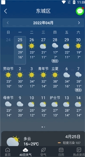 2、在40日天气预报功能里,用户能够查看未来四十天内的天气状况。