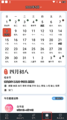 4、点击日历,这里不仅为用户提供了日历功能,还附带了今日星座运势的内容。