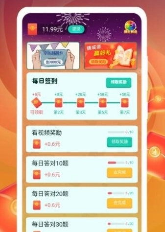 1.完成答题就能领取对应题目的红包,连续答对还有额外的红包可以领