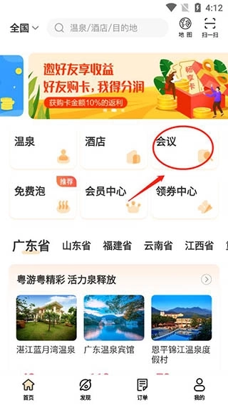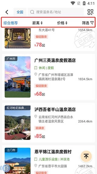 2、接着选择预定地区,在搜索栏搜索温泉名;