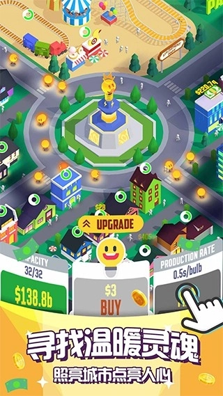 点亮城市的核心玩法,是为漆黑的城市带来光亮。照亮的区域越广,你能收获的收益就越丰厚。一旦灯光不足,玩家就得招募灯泡小精灵,借助它们的力量点亮更多角落。看着原本一片漆黑的地图逐渐变得热闹繁荣,你会油然而生满满的成就感!点亮城市,点亮的不仅是城市本身,更是你内心的那份温暖与满足。