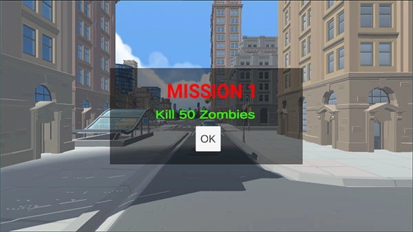 2、战斗开始前,会展示出需完成的特定任务,比如第一关要求击杀50个僵尸。