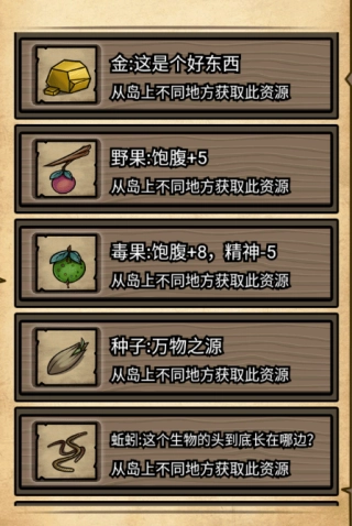 2. 金子、野果、毒果、种子以及蚯蚓。