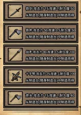 8、包含铁剑、铁斧、战矛、十字弩以及斧头。