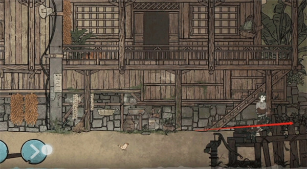 3、往右侧行进至住所,交谈结束后,移步至右边的竹梯处,顺着竹梯上楼。