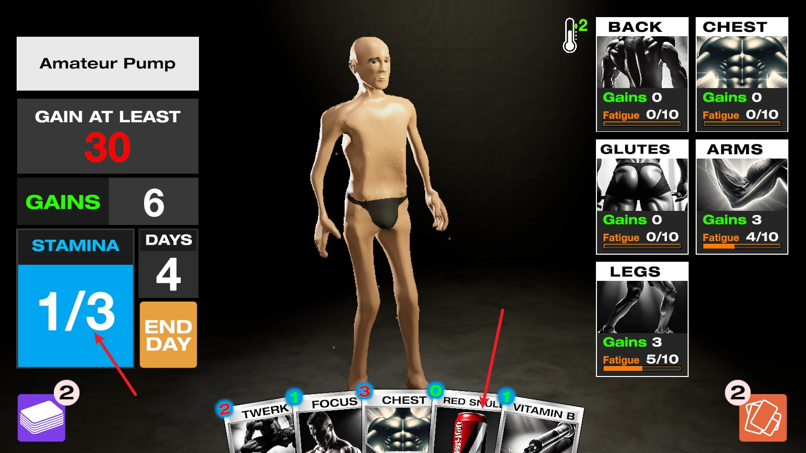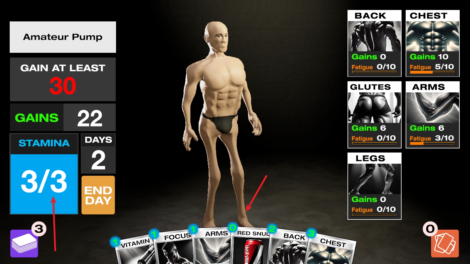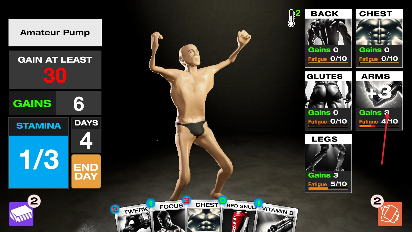 进入之后,我们借助打出卡牌的形式开展健身训练,每张卡牌都会消耗左侧相应的能量值。