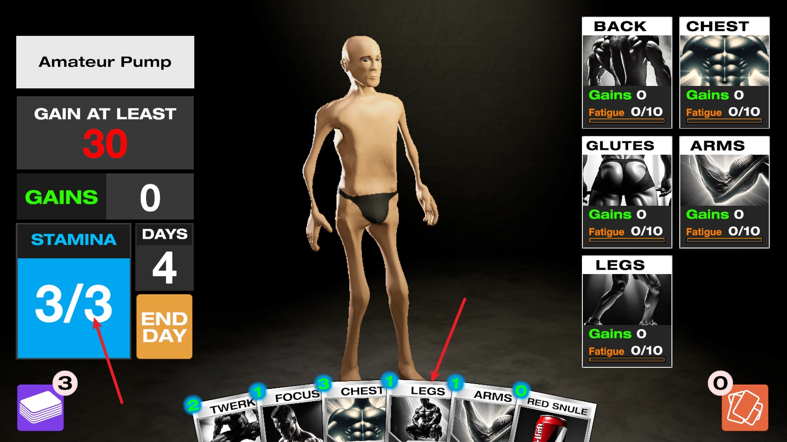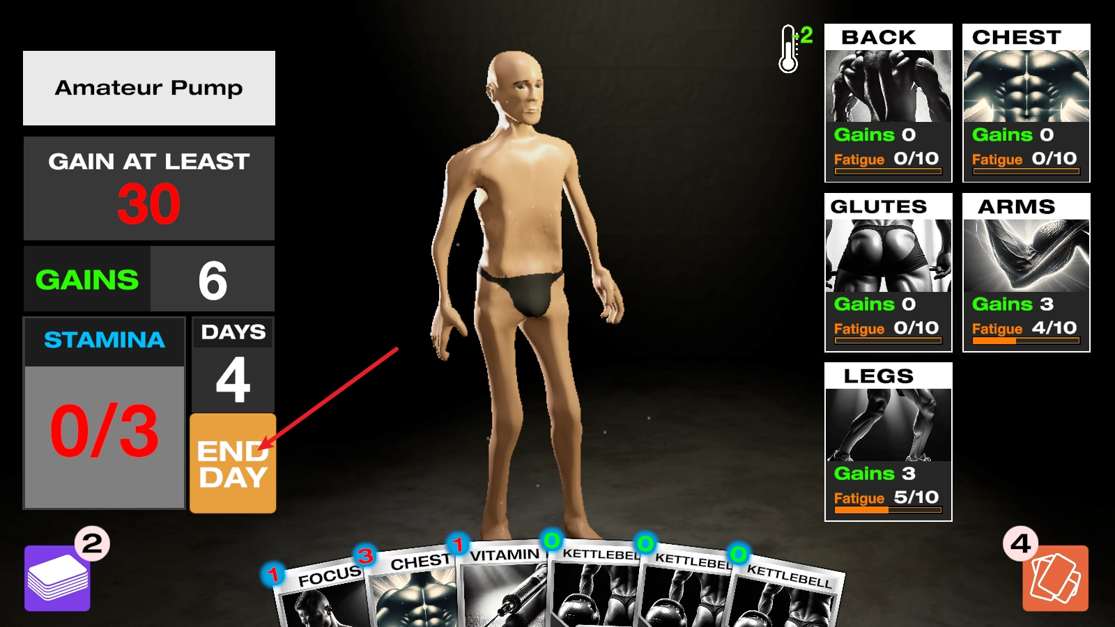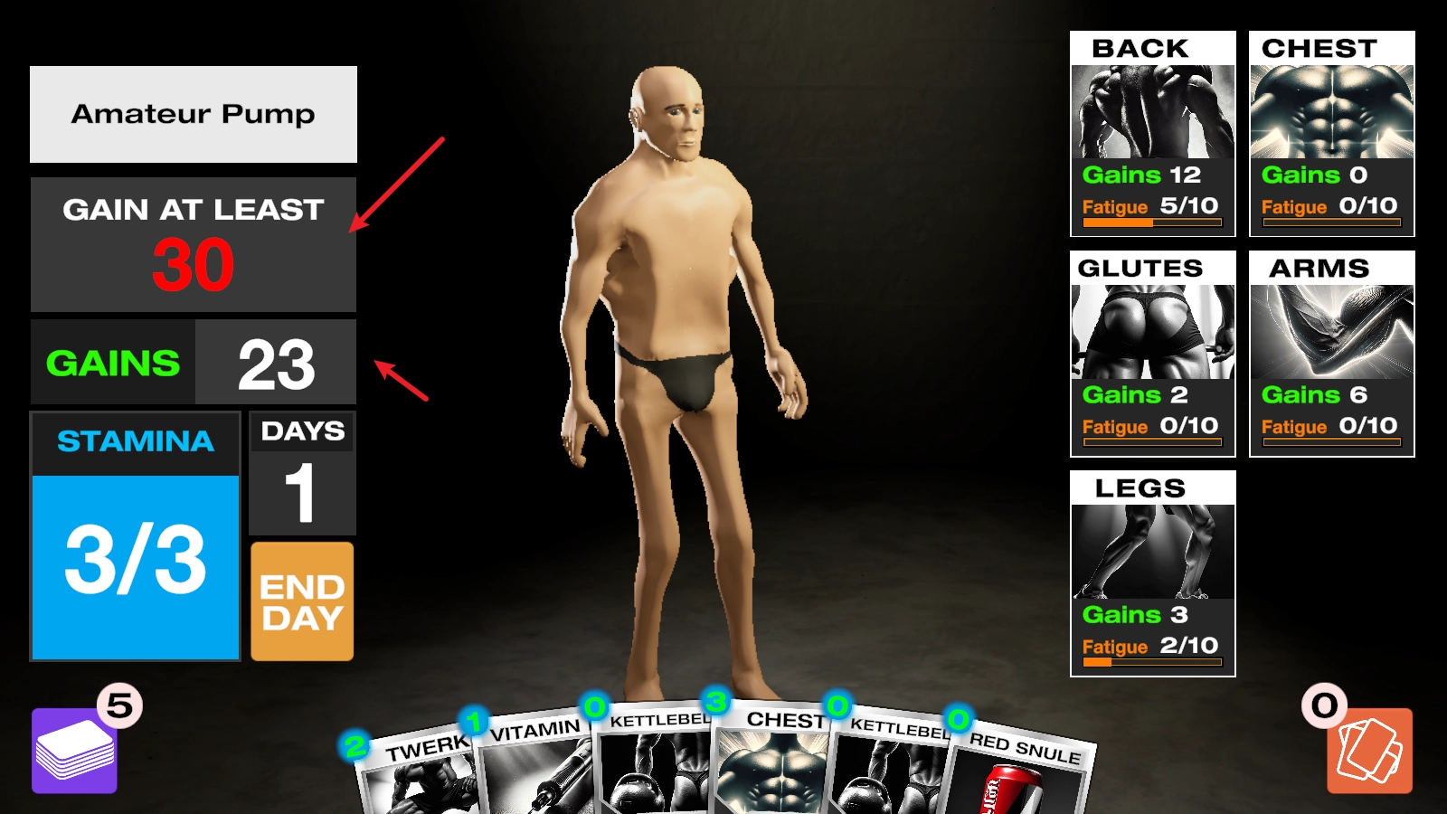 进入之后,我们借助打出卡牌的形式开展健身训练,每张卡牌都会消耗左侧相应的能量值。
