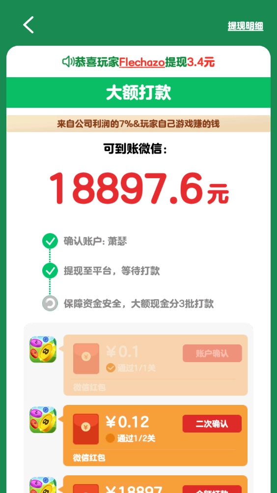 是真的,只要在游戏里合成闯过第一关,就能拿到0.1元的红包奖励;之后继续合成,闯过第二关,还能再获得0.12元的奖励。后面通过积累的筹码,能按照万分之一的比例兑换到微信里!