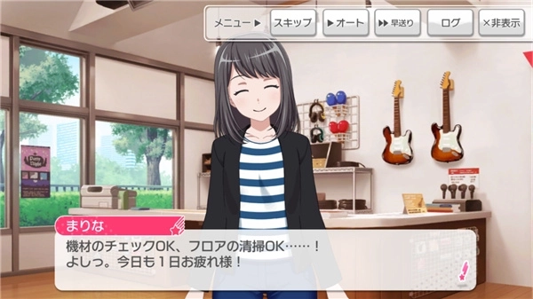 完成后会出现一小段剧情,内容是Poppin'Party各成员的自我介绍。点击右上角的「メニュー(菜单)」按钮,会弹出「スキップ(跳过)」「オート(自动)」「早送り(快进)」「ログ(记录)」和「非表示(隐藏UI)」五个选项,这和其他视觉小说类游戏的设置是一样的。