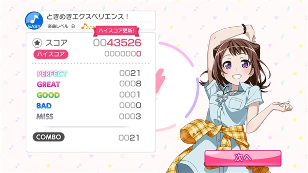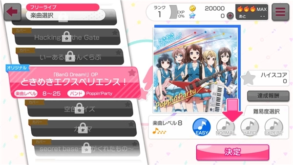 接下来进入BanGDream的LIVE环节,新手教程阶段仅能体验本家曲目「ときめきエクスペリエンス」的其中一段,但难度支持自主选择,从最简单的Easy到最难的Expert都有。另外要说明的是,GBP的LIVE采用非体力限制模式,只要想玩就能随时开启;唯一会消耗的是画面右上角的火焰道具(即LIVEBOOST),它每30分钟恢复1个,每次进行LIVE都会自动消耗1个,触发后在LIVE过程中获得的金币、经验值和报酬都会变成平时的5倍。