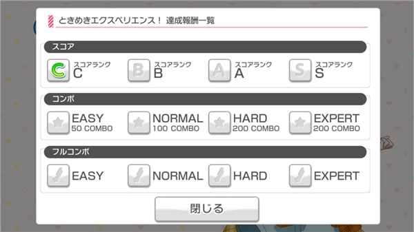 接下来呈现的是成就画面,成就类型分为「分数」「指定Combo以上」以及「FullCombo」三种,其中后两类会对应不同的难度等级。达成这些成就后,玩家将能获取金币、角色升级所需的训练券以及石头等各类不同奖励。