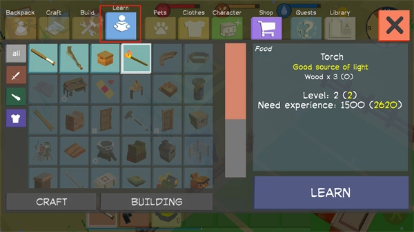 玩家能够点击Learn按钮,以此掌握部分高级道具的制作技巧。