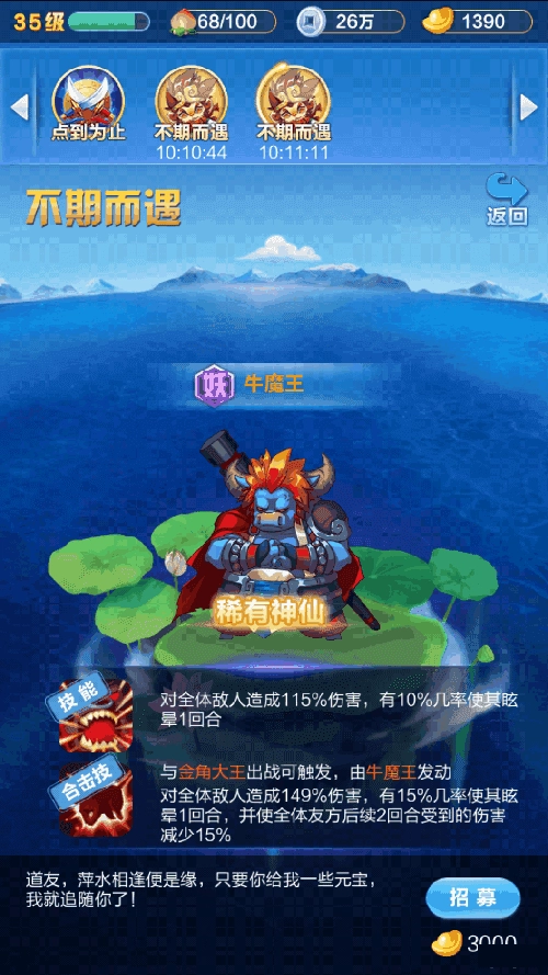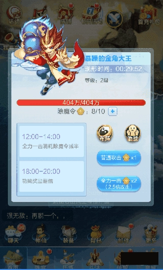这个尽量选在中午12点到14点、晚上6点到8点这两个时间段进行,其他时间段只要确保除魔令不溢出就行;另外,打怪刷出来的战功,是除了竞技场之外能获取稀有橙将的一个途径。