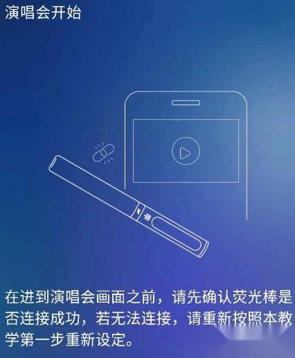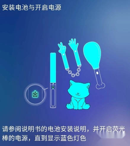 给应援棒安装电池并且开启电源,直到蓝色为止。