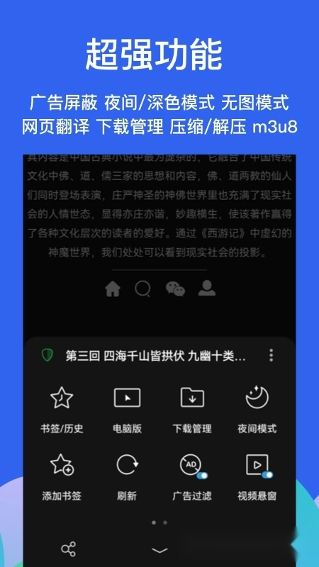 阅读模式具备智能拼页功能,它不只是浏览器,更是一款出色的小说神器。用户可自定义设置壁纸、站点图标、网站主页、搜索引擎和浏览器标识,打造沉浸式的私人定制体验。